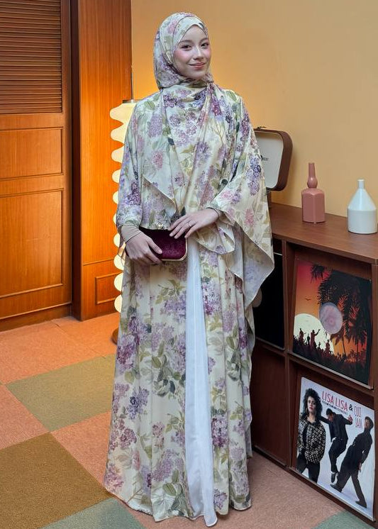 [PRE ORDER] Raysha Outerwear Abaya 3.0 with Matching Printed Shawl (Lime Lilac)